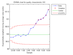 In statistical quality control, the EWMA chart (or exponentially weighted moving average chart) is a type of control chart used to monitor either variables or attributes-type data using the monitored business or industrial process's entire history of output.[1] While other control charts treat rational subgroups of samples individually, the EWMA chart tracks the exponentially-weighted moving average of all prior sample means. EWMA weights samples in geometrically decreasing order so that the most recent samples are weighted most highly while the most distant samples contribute very little.[2]:406