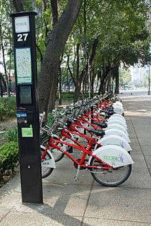 EcoBici is the bicycle sharing system launched in February 2010 by the government of Mexico City.[1] Initially launched with 85 docking stations and 1,000 distinctive red and white liveried bicycles, the network then expanded by September 2013 to be at 276 stations with 4,000 bicycles,[2] and as of April 2015, now has 444 stations with 6,000 bicycles.[3]