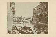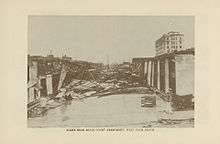 Skylights at the county courthouse shattered, flooding the Criminal Court of Record rooms.[49] Many of the buildings that collapsed were wooden-frame, while the few concrete-built structures remained standing.[50] Because the hospital was partially destroyed, a temporary hospital was set up in the Pennsylvania Hotel.[51] However, the hotel itself was damaged; the chimney crashed through 14 floors, causing about $60,000 in damage.[52] The fire station also collapsed, though the fire bell remained intact.[30] At the city library, then located at City Park (now known as Flagler Park), more than half of the books were destroyed and the floor was covered with about 2 ft (0.61 m) of water and mud.[53]