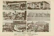 In Palm Beach, about fifty men shoveled sand off Ocean Boulevard and cut down damaged palm trees with crosscut saws.[127] On September 19, then-Mayor of West Palm Beach Vincent Oaksmith issued a "no work, no food" order, effectively stating that all able-boded men should work toward relief efforts.[77] The Delray Beach City Council issued a similar order.[128] Initially, rebuilding in West Palm Beach was slow. City Manager A. E. Parker issued a public notice that stated "Because of the grave emergency now existing and the great need for shelter, it has not been deemed wise to insist upon building permits for necessary repairs." Many severely damaged buildings were declared "public menaces" and condemned for demolition, effective on October 23. On September 20, the West Palm Beach City Commission held a special session that allowed the City Treasurer to authorize an in advance requisition payment of $50,000 to the Red Cross. Also on the agenda was an anti-price gauging measure, which would fine individuals up to $500 and imprison them for a maximum of 30 days if they sold items above the pre-September 16 price.[129]