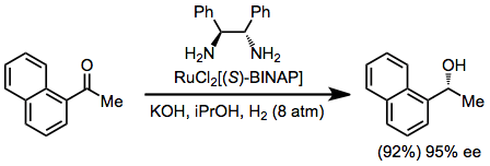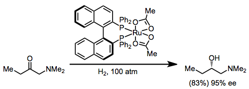 Transition metal catalysts have also been used with hydrogen gas as the stoichiometric reductant. Ketones with a chelating group undergo enantioselective reduction in the presence of a chiral Ru(BINAP) catalyst.[16] The configuration of the new stereocenter is predictable using the stereochemical model developed for hydrogenations employing BINAP (see equation (3) above).