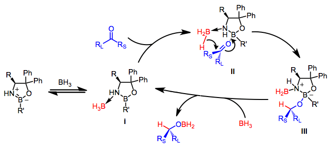 The mechanism of oxazaborolidine reductions has been supported by ab initio calculations.[6] Coordination of borane to the oxazaborolidine nitrogen generates the complex I, which then coordinates a molecule of ketone to yield complex II. In the transition state for hydride transfer (II → III), the large substituent of the ketone is aligned inward to avoid steric interactions with the outward-pointing R group of the oxazaborolidine, which is often tethered to the nitrogen atom. After hydride transfer, complex III releases the product and coordinates a second molecule of borane.