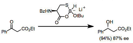 The catalytic, asymmetric reduction of ketones may be accomplished through the use of catalytic amounts of an oxazaborolidine catalyst in conjunction with borane or catecholborane as the stoichiometric reducing agent.[3] Oxazaborolidines remain in common use for reductions of simple ketones.