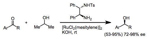 Reduction via the net transfer of hydrogen from one organic molecule to another is known as transfer hydrogenation. Transfer hydrogenation to ketones leads to alcohols (the Meerwein-Ponndorf-Verley reduction), and in the presence of a chiral transition metal catalyst, this process may be rendered enantioselective. In the presence of a chiral diamine, ruthenium catalyzes the enantioselective transfer hydrogenation of aryl ketones with isopropanol.[12] Other metals that have been employed include samarium(III),[13] iridium(I),[14] and rhodium(I).[15]