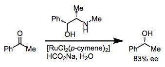 Formic acid and formate salts may also be used as reductants in transfer hydrogenations. Simple aryl ketones are reduced enantioselectively when a chiral amino alcohol ligand is employed.[4]