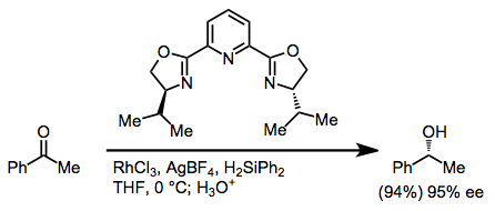 Hydrosilylation may be used to reduce ketones after silyl ether hydrolysis. Rhodium(I) and rhodium(III) salts are the most common catalysts for hydrosilylation. Asymmetric induction may be conferred by chiral PYBOX ligands.[17]
