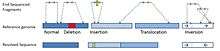 Inversions and translocations are relatively easy to detect by an invalid pair of sequenced-end. For instance, a translocation can be detected if the paired-ends are mapped onto different chromosomes on the reference genome.[4][5] Inversion can be detected by divergent orientation of the reads, where the insert will have two plus-end or two minus-end.