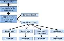 In the case of an insertion or a deletion, mapping of the paired-end is consistent with the reference genome. But the read are disconcordant in apparent size. The apparent size is the distance of the BAC sequenced-ends mapped in the reference genome. If a BAC has an insert of length (l), a concordant mapping will show a fragment of size (l) in the reference genome. If the paired-ends are closer than distance (l), an insertion is suspected in the sampled DNA. A distance of (l< µ-3σ) can be used as a cut-off to detect an insertion, where µ is the mean length of the insert and σ is the standard deviation.[5][6] In case of a deletion, the paired-ends are mapped further away in the reference genome compared to the expected distance (l> µ-3σ).[6]