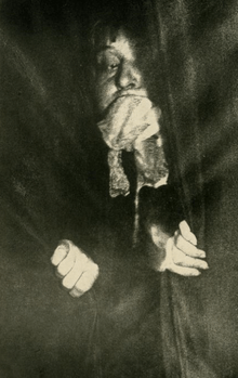 The psychical researcher Gustav Geley investigated Carrière and wrote she was a genuine medium but never-published photographs were discovered after Geley's death which revealed fraudulent activity from the medium's companion, Juliette Bisson, such as wires seen running from Carrière's head supporting fake ectoplasm.[8] Another researcher Albert von Schrenck-Notzing also investigated Carrière and believed the ectoplasm she produced was genuine. The psychiatrist Mathilde Ludendorff wrote that the experiments of Schrenck-Notzing were unscientific and that he had been duped by tricks of Carrière.[9] In the Schrenck-Notzing mediumship sessions with Carrière the scientific controls were scarce and there was evidence that she had freed her hands in the séance room.[10]