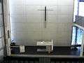 The simple altar is made of smooth concrete and hangs freely. The baptismal font is embedded in the altar. The Easter candle stands on a stone from the Sea of Galilee.