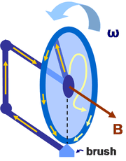Careful thought showed that, if the magnetic field was assumed to rotate with the magnet and the magnet rotated with the disk, a current should still be produced, not by EMF in the disk (there is no relative motion between the disk and the magnet) but in the external circuit linking the brushes,[8] which is in fact in relative motion with respect to the rotating magnet. (The brushes are in the laboratory frame.)
