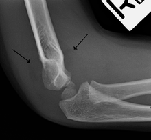Fat pad sign: Ventral fat pad bowed and dorsal fat pad visible in a case of an undisplaced fracture of the radius head which is not visible directly.