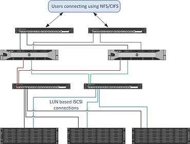 The underlying software architecture of FluidFS employs a Linux based symmetric clustering model with distributed metadata, native load balancing, flexible caching capabilities and other features. Its scalability is not limited by volume size as with traditional file systems, and supports scaling up (adding capacity to the system) and by scaling out (adding nodes, or performance, to the system.FluidFS operates across a symmetric cluster of purpose-built NAS controllers (housed in pairs within a 2U appliance), which interface over a fabric to shared back-end storage via iSCSI or Fibre Channel storage area networks.
