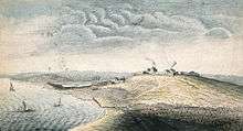 Fort Edward played an important role in the Bay of Fundy Campaign (1755) of the Acadian Expulsion. Shortly after the Battle of Fort Beauséjour on the eve of the Expulsion, the commander at Fort Edward Captain Alexander Murray wrote his wife saying the Acadians "are in as great anxiety as I am about their fate".[12] A month later, at exactly the same time as Lieutenant Colonel John Winslow read the expulsion orders in Grand Pré; September 5 at 15:00 hrs, Captain Murray read the order to the 183 Acadian males he had imprisoned at Fort Edward.[13] On October 20, 920 Acadians from Piziquid were loaded on to four transports.[14] Unlike the neighbouring community of Grand Pré, the buildings at Pisiquid were not destroyed by fire. As a result, when the New England Planters arrived, many houses and barns still stood there.[15][16] Fort Edward was one of four forts in which Acadians were imprisoned over the nine years of the expulsion (the others were Fort Frederick, Saint John, New Brunswick; Fort Cumberland; and Fort Charlotte, Georges Island, Halifax). On average, over a period of nine years, there were 350 Acadian prisoners at one time held at the garrison.[17]