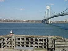 New York City was not attacked by sea in the Civil War, so the forts did not have an active role. However, they were important as mobilization centers, including Smith's Cantonment near the forts.[2] The North and South Cliff batteries were built flanking Fort Richmond, which was renamed Fort Wadsworth in 1865. Two small batteries of two and five guns were also built near Fort Tompkins.[2] Following the war, it was determined that masonry forts were obsolete. In the 1870s a large-scale but short-lived program of building new earth-protected batteries near existing forts commenced. The new defenses were mainly armed with Rodman guns, large smoothbores of 15-inch and 10-inch caliber along with 8-inch converted rifles. At Fort Wadsworth, this included improvements to the batteries built during the Civil War, along with rebuilding Battery Hudson for new guns and a new mortar battery near Fort Tompkins that was never armed.[2] Battery Hudson included an emplacement for the United States' first type of disappearing gun, a 15-inch Rodman on King's depression carriage, which was not widely adopted. A mine casemate for controlling an underwater minefield was built in Fort Richmond in 1875 and was later re-used when mines became a standard part of the harbor defenses.[2] In the late 1870s funding for coast defenses was cut off, and it was 20 years before significant new defenses were completed.