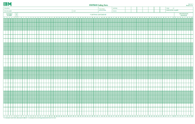 A FORTRAN coding form, printed on paper and intended to be used by programmers to prepare programs for punching onto cards by keypunch operators. Now obsolete.