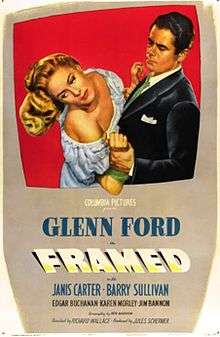 Framed is a 1947 American film noir directed by Richard Wallace and featuring Glenn Ford, Janis Carter, Barry Sullivan and Edgar Buchanan. The B movie is generally praised by critics as an effective crime thriller despite its low budget.[1]