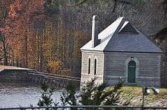 The Framingham Reservoir No. 2 Dam and Gatehouse is a historic water works facility in Framingham, Massachusetts. The dam and gatehouse are located west of the junction of Winter and Fountain Streets, and impound a branch of the Sudbury River. The reservoir was built 1877-79 as part of an expansion of the water supply of the city of Boston. The dam is 1,376 feet (419 m) in length, with a centered overfall area. The core of the dam is granite rubble laid in cement, with earthen embankments. The overfall area is faced on the downstream side with cut granite, and earthen embankment on the upstream side. It is topped with granite and originally had iron mounts for flashboards. The gatehouse is a rectangular granite structure with a steep hip roof, a brick chimney and an eyebrow dormer. The door and windows are in round-arch openings. It contains gate controls for regulating water flow from the reservoir and from a 4-foot (1.2 m) pipe connected to Reservoir No. 1, and a 2-foot (0.61 m) pipe connected to the Ashland Reservoir.[2]