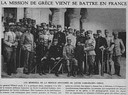 The 1911–1914 French military mission to Greece was called to Greece by the government of Eleftherios Venizelos to reorganize the Hellenic Army, parallel to a British naval mission for the Royal Hellenic Navy. The French mission arrived in January 1911, under the command of General Joseph-Paul Eydoux, replaced in April 1914 by General Étienne de Villaret (who had also served in a mission to Japan earlier in his career). It remained in the country until the outbreak of World War I in August 1914, when it was repatriated.