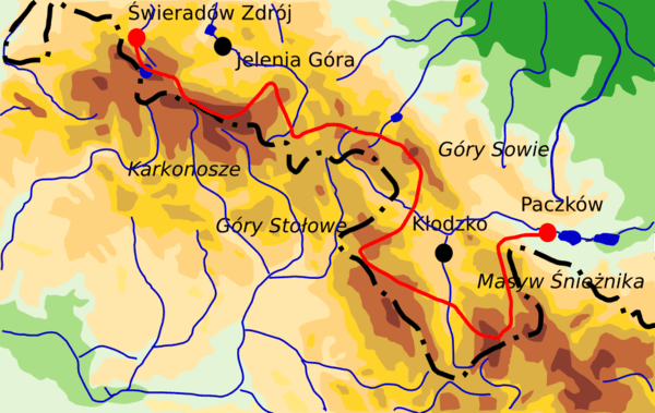 The trail starts in Świeradów Zdrój in the Jizera Mountains. In Szklarska Poręba it enters Karkonosze, the highest mountain range on its way. For the next 20 km it merges with the Polish - Czech Friendship Trail at Szrenica and runs on the main ridge along Polish and Czech border, to reach its culminating point, the highest peak in the Sudetes - Śnieżka. The path then descends to Karpacz and leads through another mountain range - Rudawy Janowickie. Having passed Krzeszów, the Stone Mountains and Owl Mountains the trail enters the area of the Kłodzko Valley and runs along the ridge of the Table Mountains with its reserves, spas such as Polanica-Zdrój, Duszniki-Zdrój and Kudowa-Zdrój and the Table Mountains National Park, one of the youngest national parks in Poland. Then it inclines to the north to run through the Śnieżnik Mountains, the second highest point on the route, then along the Golden Mountains. The trail finishes in Paczków, although for several years there has been a detached part in Prudnik (Opawskie Mountains).
