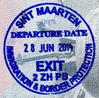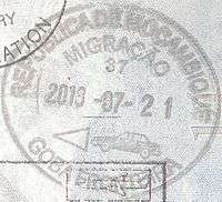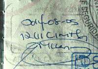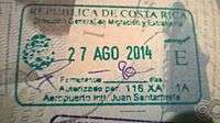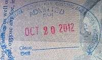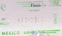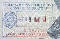 - ↑ Though stamps are issued upon both arrival and departure, there are only minor differences. The first 3 numbers after the date are assigned to the various points of entry and exit. The next number indicates entry or exit, '1' for entry, '2' for exit. The four digit number along the right edge is the Federal Police agent that made the stamp.
