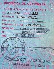 - ↑ Guatemala uses many different stamps with various Mayan glyphs. But there is no difference in design between entry or exit stamps. Entry or exit is marked separately by border officials.