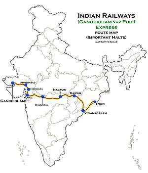 Gandhidham-Puri Express is an express train belonging to Indian Railways that runs between Gandhidham and Puri via Vizianagaram as a weekly service. It is maintained by Western Railway Zone.