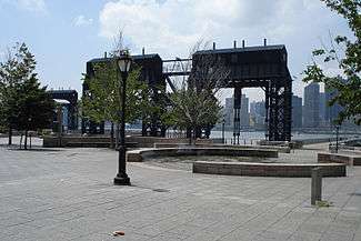 The southern portion of the park is a former dock facility and includes restored "contained apron" transfer bridges of the James B. French patent.[3] These were built in 1925 to load and unload rail car floats that served industries on Long Island via the Long Island Rail Road tracks that used to run along 48th Avenue (now part of Hunter's Point Park). The northern portion of Gantry Plaza State Park was part of a former Pepsi bottling plant that closed in 1999.[4][5]