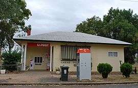 Facilities in the town include a post office, primary school, police station, tennis courts, grain silo, CWA hall, town hall, pre-school, corner shop, pub, race course, small petrol bowser, Catholic church and a Presbyterian Church. Local activities include agriculture.