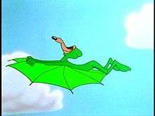 4. Wile E. then puts on a Batman outfit and dives off a cliff. He finally gains traction just before falling onto some spikey rocks, and then flies in circles through the air. He continues to fly in a straight line, oblivious, until he smashes into a huge mountainside. The wings stick to the rock and the Coyote is left grappling in the air until he slams into the ground below. This scene was reused (with narration) in 1962's Adventures of the Road Runner.