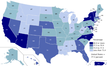 In 2007, women's earnings were lower than men's earnings in all states and the District of Columbia according to the Income, Earnings, and Poverty Data From the 2007 American Community Survey by the Census Bureau. The national female-to-male earnings ratio was 77.5%. In the South, five states (Maryland, North Carolina, Florida, Georgia, and Texas) and the District of Columbia had ratios higher than the national ratio, as did three states in the West (California, Arizona, and Colorado). Two states in the Northeast (Vermont and New York) had ratios higher than the national ratio. There were no states in the Midwest that had ratios higher than the national ratio. As a result, women's earnings were closer to men's in more states in the South and the West than in the Northeast and the Midwest.[11]
