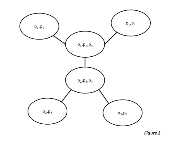 Then constructing the tree only with these local domains is not possible since this set of values has no common domains which can be placed between any two values of the above set. But however if add the two dummy domains as shown below then organizing the updated set into a junction tree would be possible and easy too.