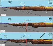 The last and most recent stage in the evolution of the Antarctic Peninsula subduction zone is the opening of the Bransfield Rift,[2][5] creating the Bransfield back-arc basin from the Oligocene to the present day.[2] This basin separates the inner, older magmatic arc (mainland Antarctic Peninsula) from the outer, younger magmatic arc (South Shetland Islands).[9] Alkaline and tholeiitic volcanic activity is associated with this rifting event.