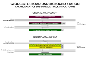 On 30 June 1900, the Middle Circle service was withdrawn between Earl's Court and Mansion House,[9] and, on 31 December 1908, the Outer Circle service was also shortened to terminate at Earl's Court.[10] In 1949, the Metropolitan line-operated Inner Circle route was given its own identity on the tube map as the Circle line. In 1907, "Brompton" was dropped from the station's name to bring it into accordance with the deep-level station.[2]