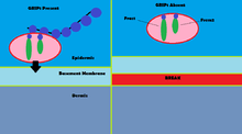 Mutations to GRIP1 play a role in less than 10% of confirmed cases of the group of congenital defects known as Fraser syndrome.[13] Using immunofluorescence, it has been shown that GRIP1 is found in several kinds of embryonic tissues, including the GI tract, ureter buds, skin and oral and nasal cavities.[14] GRIP1 is also essential for proper function and structure of the dermo-epidermal junction.[15] In mouse models, knocking out GRIP1 protein leads to several deformities that begin in embryo. These deformities include subepidermal hemorrhagic blistering, renal agenesis, syndactylism, polydactylism and cryptopthalmos.[14] One study has shown that complete knock-out of GRIP1 leads to the absence of kidneys.[14] Another study shows blistering of embryonic tissue that GRIP1 is expressed in by day 12 of embryonic life in mice.[15]