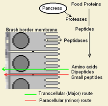 In the normal gut, proteins are digested to peptides by pepsin (stomach), trypsin and chymotrypsin (derived from the pancreas and activated in the gut). Peptides are further digested when they approach the villi, where brush border peptidases break proteins into amino acids. Over much of the small intestine only small solutes, like water, can cross the tight junctions, however some regions of the intestine peptides as large as 500 daltons (4 amino-acids residues in length can cross).[1]