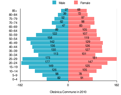 According to the 2011 Poland census, there were 3,891 people residing in Oleśnica Commune, of whom 49.7% were male and 50.3% were female. In the commune, the population was spread out with 19.3% under the age of 18, 38.9% from 18 to 44, 22.5% from 45 to 64, and 19.3% who were 65 years of age or older.[1]