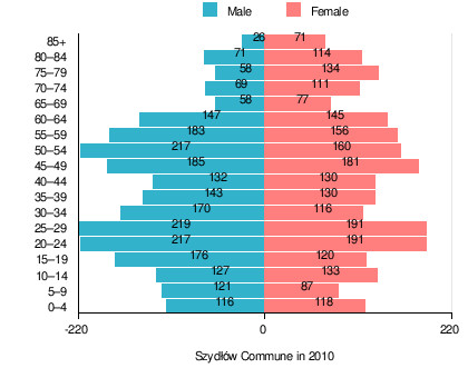 According to the 2011 Poland census, there were 4,800 people residing in Szydłów Commune, of whom 50.7% were male and 49.3% were female. In the commune, the population was spread out with 18.1% under the age of 18, 36.8% from 18 to 44, 25.6% from 45 to 64, and 19.5% who were 65 years of age or older.[1]