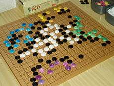 Environmental Go, also called Coupon Go,[5] invented by Elwyn Berlekamp, adds an element of mathematical precision to the game by compelling players to make quantitative decisions.[6] In lieu of playing a stone, a player may take the highest remaining card from a pack of cards valued in steps of ½ from ½ to 20: the player's score will be the territory captured, plus the total value of cards taken. In effect, the players participate in a downward auction for the number of points they think sente is worth at each stage in the game. The professional players Jiang Zhujiu and Rui Naiwei played the first Environmental Go game in April 1998. Since then the variant has seen little activity on the international scene.