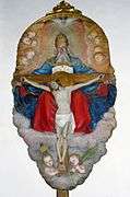 In Renaissance paintings of the adoration of the Trinity, God may be depicted in two ways, either with emphasis on The Father, or the three elements of the Trinity. The most usual depiction of the Trinity in Renaissance art depicts God the Father as an old man, usually with a long beard and patriarchal in appearance, sometimes with a triangular halo (as a reference to the Trinity), or with a papal tiara, specially in Northern Renaissance painting. In these depictions The Father may hold a globe or book. He is behind and above Christ on the Cross in the Throne of Mercy iconography. A dove, the symbol of the Holy Spirit may hover above. Various people from different classes of society, e.g. kings, popes or martyrs may be present in the picture. In a Trinitarian Pietà, God the Father is often shown wearing a papal dress and a papal tiara, supporting the dead Christ in his arms. They float in heaven with angels who carry the instruments of the Passion.[21]