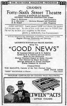 The original Broadway production, directed by Edgar MacGregor and choreographed by Bobby Connolly, opened on September 6, 1927 at The 46th Street Theatre, where it ran for 557 performances, which was a very successful run, as few Broadway shows had reached 500 performances since 1919's Irene. The cast included John Price Jones as Tom Marlowe, Mary Lawlor as Connie Lane, Gus Shy as Bobby Randall, Inez Courtney as Babe O'Day, and Zelma O'Neal as Flo. Donald Oenslager designed the production's sets. To emphasize the collegiate atmosphere, ushers wore jerseys, and George Olsen's band (featured as the "College Band") reached the orchestra pit by running down the aisles as they shouted college cheers.[2] University of Notre Dame football coach Knute Rockne received credit for "Advice in Football Technique".[3] The musical was set in what was then the present day, the Roaring Twenties, and, according to musical theatre historian Gerald Bordman, it was clearly a reflection of that era: "The decade's jazzy sounds, its assertive, explosive beat, its sophomoric high jinks were joyously mirrored..."[2] The plot hinged on a professor's unexpected generosity: Tom fails Professor Charles Kenyon's astronomy class, and, even though Connie tutors him, he still fails his makeup exam. Professor Kenyon gives him a passing grade, though, because he, unbeknownst to the students, is actually a football fan.
