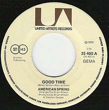 "Good Time" is a song written by Brian Wilson and Al Jardine for the American rock band the Beach Boys. The instrumental track and vocals were recorded by the group in early 1970 but was left unreleased by the group until the 1977 album Love You. In 1972 American pop duo American Spring released "Good Time" as their second single, recording their voices atop the Beach Boys' instrumental track.[2]