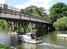 A bridge was first built here in 1837 being a flat timber bridge of beams on posts. Prior to this there was a ferry although occasionally people would ride across, even driving in a one-horse chaise. In 1674 the ferry turned over in the weir pool with the loss of sixty lives.[2] In the 1970s a Citroën Dyane crashed through the railings at the Streatley end of the bridge landing on a concrete weir 16 feet below. The local Citroën dealer used the photo to illustrate the inherent strength of their upmarket 2CV