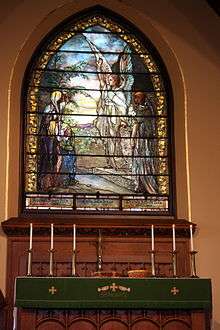 The building is characterized by several stained glass windows in Gothic framing, flanked by stone buttresses. The largest such window is on the northwest wall, but the chancel window at the southeast, entitled "Three Marys at the Tomb", was designed by Tiffany Studios.[3] It depicts the Virgin Mary, and Mary Magdalene at the tomb on Easter morning. The window cost $3000.[4]