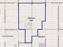 The Gramercy Park neighborhood touches Manchester Square on the north, Westmont on the east and south, and Inglewood on the west.[2] It is bounded by Manchester Boulevard on the north, Normandie Avenue and the Los Angeles city line on the east and the Los Angeles city border on the south and west.[1][3]