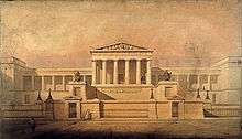 Even as Latrobe claimed that "I am a bigoted Greek in the condemnation of the Roman architecture," he did not seek to rigidly impose Greek forms, stating that "our religion requires a church wholly different from the temple, our legislative assemblies and our courts of justice, buildings of entirely different principles from their basilicas; and our amusements could not possibly be performed in their theatres or amphitheatres."[8] Latrobe's circle of junior colleagues would prove to be an informal school of Greek revivalists, and it was his influence that was to shape the next generation of American architects.