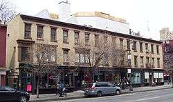 The earliest known reference to the village's name as "Greenwich" dates back to 1696, in the will of Yellis Mandeville of Greenwich; however, the village was not mentioned in the city records until 1713.[19] Sir Peter Warren began accumulating land in 1731 and built a frame house capacious enough to hold a sitting of the Assembly when smallpox rendered the city dangerous in 1739. His house, which survived until the Civil War era, overlooked the North River from a bluff; its site on the block bounded by Perry and Charles Streets, Bleecker and West 4th Streets,[20] can still be recognized by its mid-19th century rowhouses inserted into a neighborhood still retaining many houses of the 1830–37 boom.