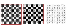 The encipherer begins with the board in the wrong position for chess. Each successive letter of the message is written in a single square. If the message is written vertically, it is taken off horizontally and vice versa.
