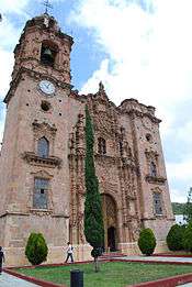 The mine made its owners, the Counts of Valenciana, extremely wealthy and powerful. The first Count of Valenciana, Antonio de Obregón y Alcocer had the San Cayetano Church (also known as the La Valenciana Church) built near the entrance of this mine.[21] Dedicated to Saint Cajetan, it was built between 1765 and 1788. The church has a Churrigueresque portal, which has been compared to the Mexico City Cathedral and the La Santisima Church, both in Mexico City. The interior conserves a number of gilded altarpieces and a pulpit that is encrusted with ivory and precious hardwoods.[4][21] The interior also contains agraffito work and paintings from the 19th century.[22]