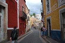 The narrow streets and alleys have given rise to a pastime called "callejoneadas." These are roving parties, traditionally held by the students of the University of Guanajuato with live musicians.[14] Today, there are callejoneadas arranged for tourists as well.[11][16]